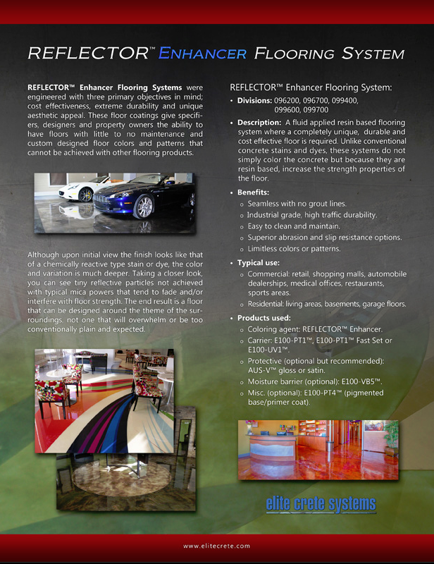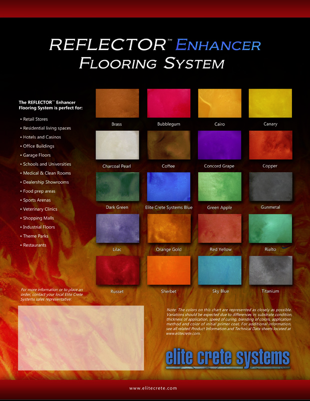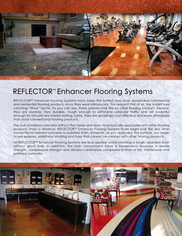 - Reflector can create a 3 dimensional depth of color by utilizing non-mica, non-metallic colorant that reflects light-it offers a sparkle to it unlike other flooring products available. Reflector’s components remain in a solid suspension and do not dissolve or mix with other particles within the solvent which allows for its dramatic effects in the final product