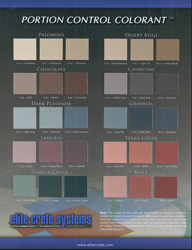 Concrete overlay products formulated with a white Portland cement base that can be integrally colored with Elite Crete colors, dyes or acid stains.